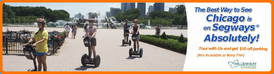 From the North, enter the garage on the right side of S. Columbus. Take an imediate right upon entering the garage. Proceed through the gate, and follow the Orange Segway Tour signs. MAKE SURE TO PARK AS FAR NORTH AS POSSIBLE. Follow signs for the "Randolph Street Pedestrian Exit" to the elevators. Take the elevators to the ground level and then walk two blocks east on Randolph St. Do NOT stop at the McDonald's bike center, we are one block further east. Look for the ORANGE signs!