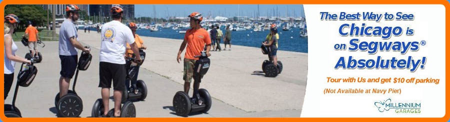 From the North, enter the garage on the right side of S. Columbus. Take an imediate right upon entering the garage. Proceed through the gate, and follow the Orange Segway Tour signs. MAKE SURE TO PARK AS FAR NORTH AS POSSIBLE. Follow signs for the "Randolph Street Pedestrian Exit" to the elevators. Take the elevators to the ground level and then walk two blocks east on Randolph St. Do NOT stop at the McDonald's bike center, we are one block further east. Look for the ORANGE signs!